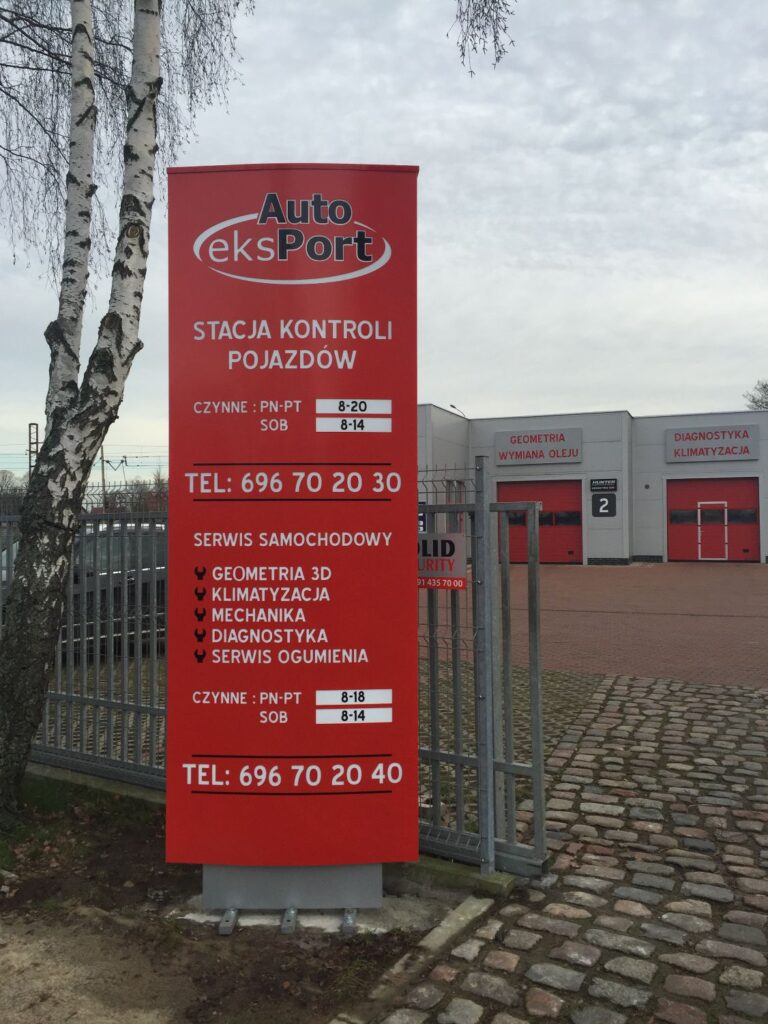 - Pylony informacyjne – tablice z oznaczeniem wjazdu, zwiększające widoczność firmy z głównej drogi, jednocześnie informujące o zakresie usług i godzinach pracy. Konstrukcja odporna na warunki atmosferyczne, idealnie wyróżniająca się z otoczenia.